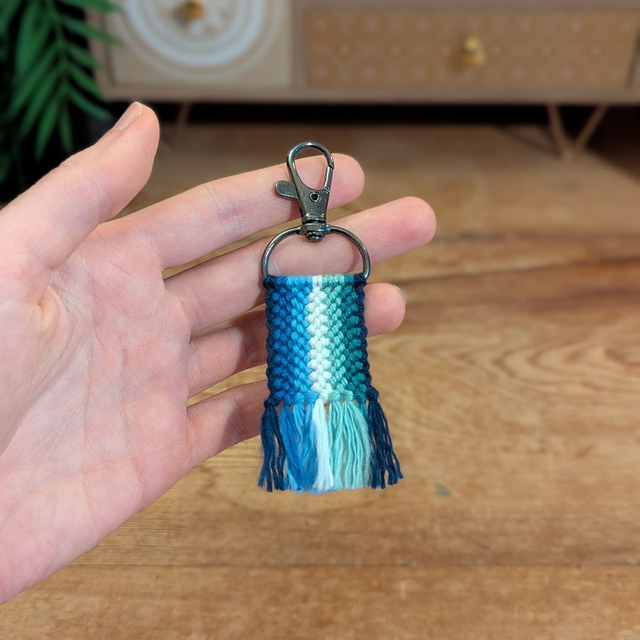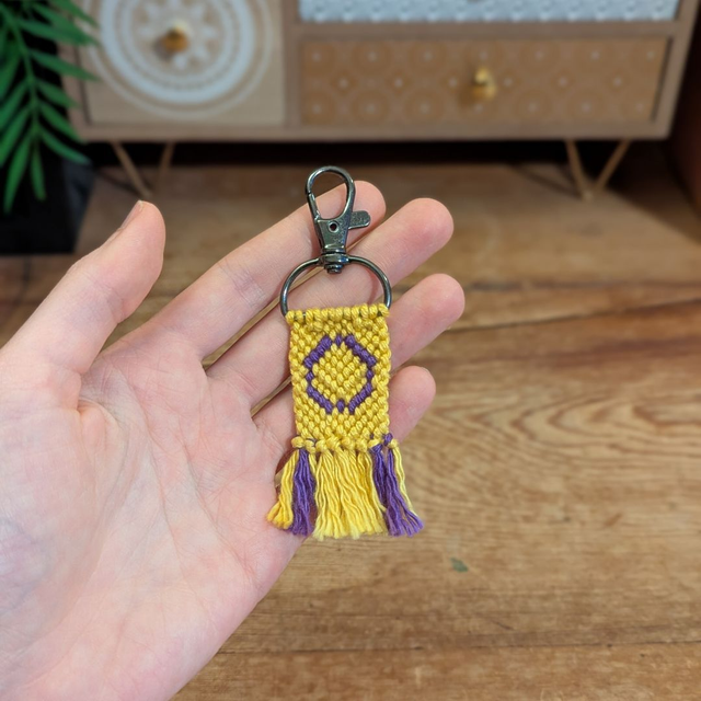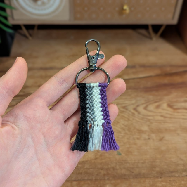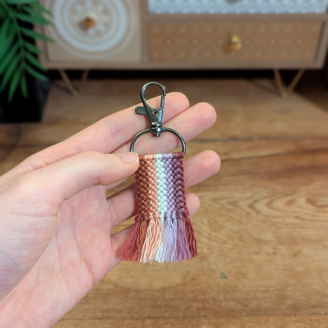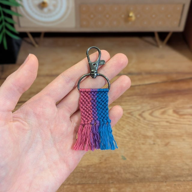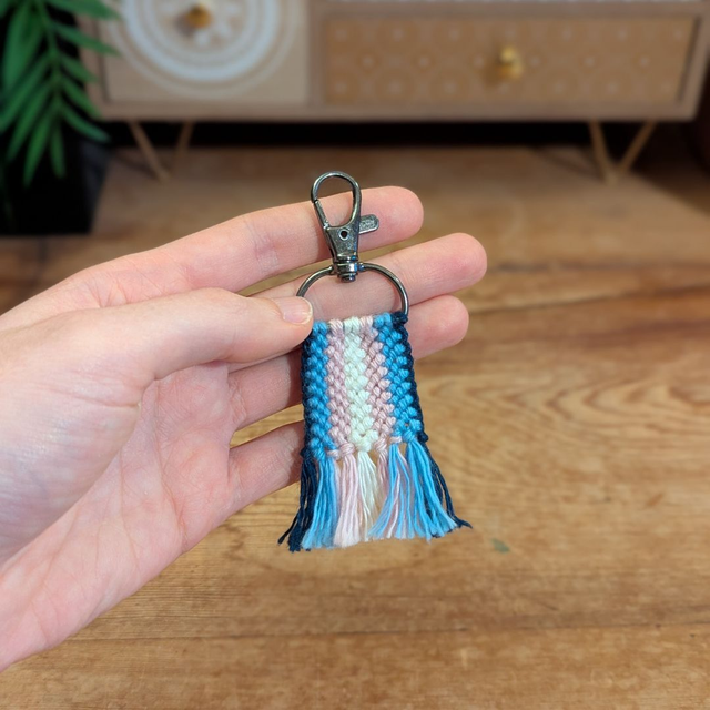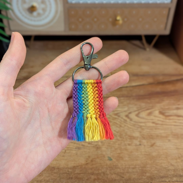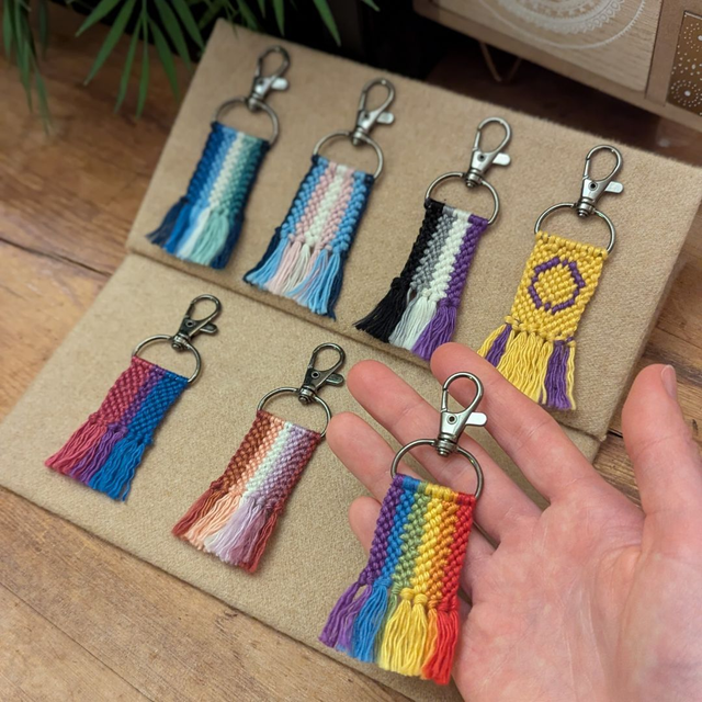 Ces porte-clés aux couleurs des drapeaux queer ont été créés pour réutiliser des restes de fils de tissage en coton.